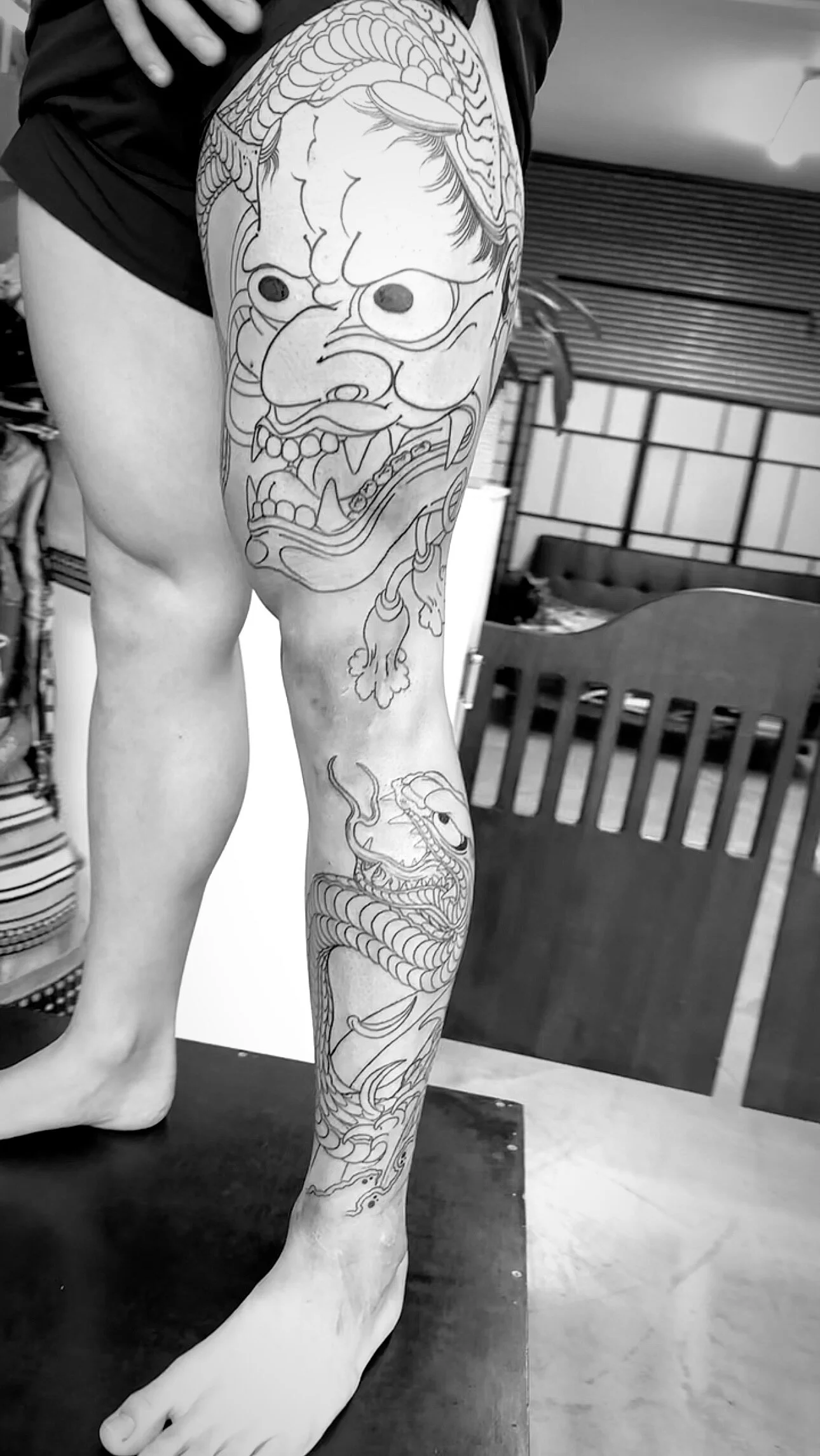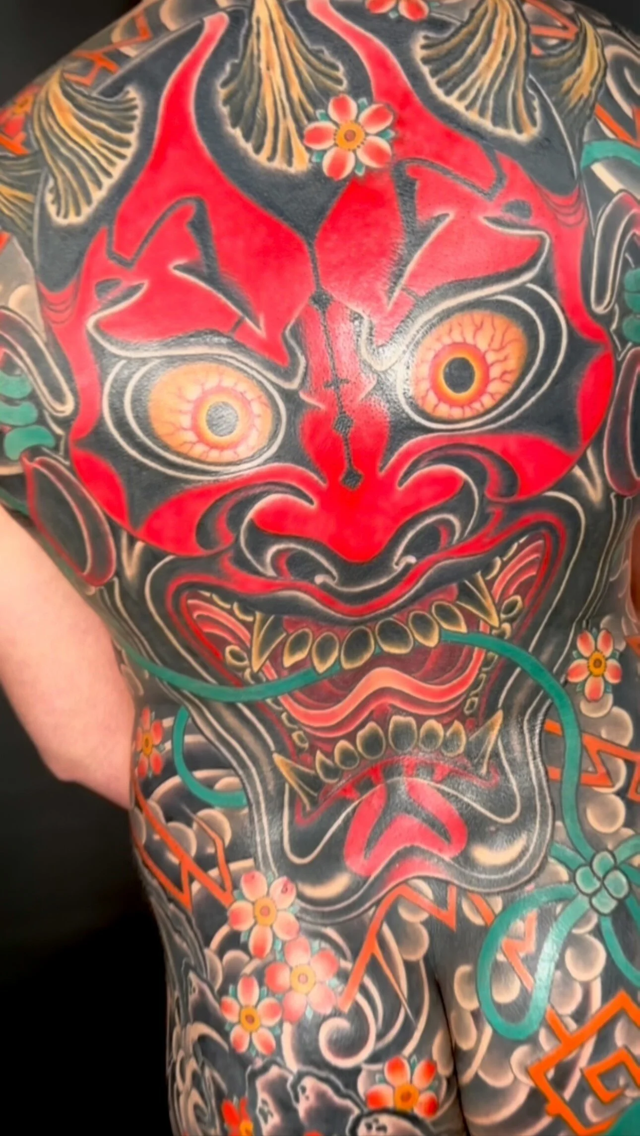 His bold shading and exciting composition reflect wonderfully in the Hannyas and dragons Japanese tattooing has to offer and nothing shows that more than Ussher’s large tattoos.”